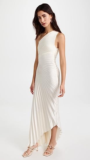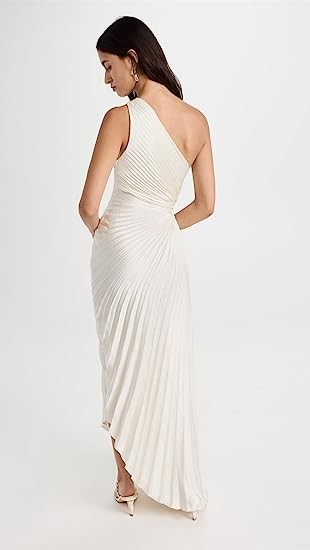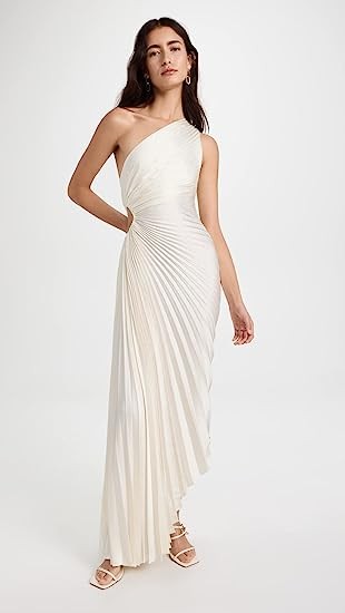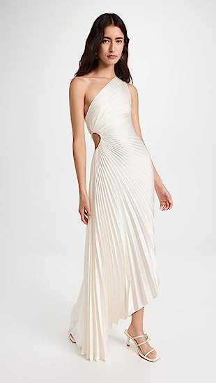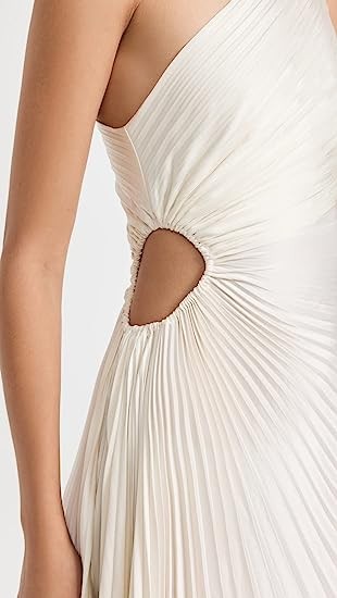 Allover pleating, One-shoulder neckline, Cutout at side, Ruching details