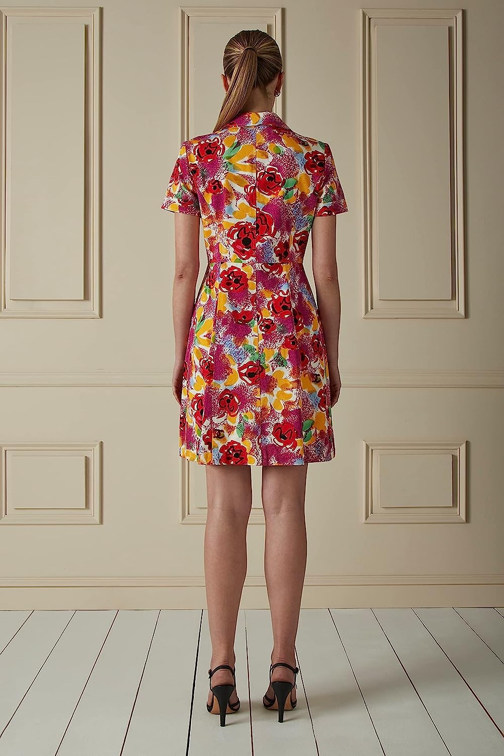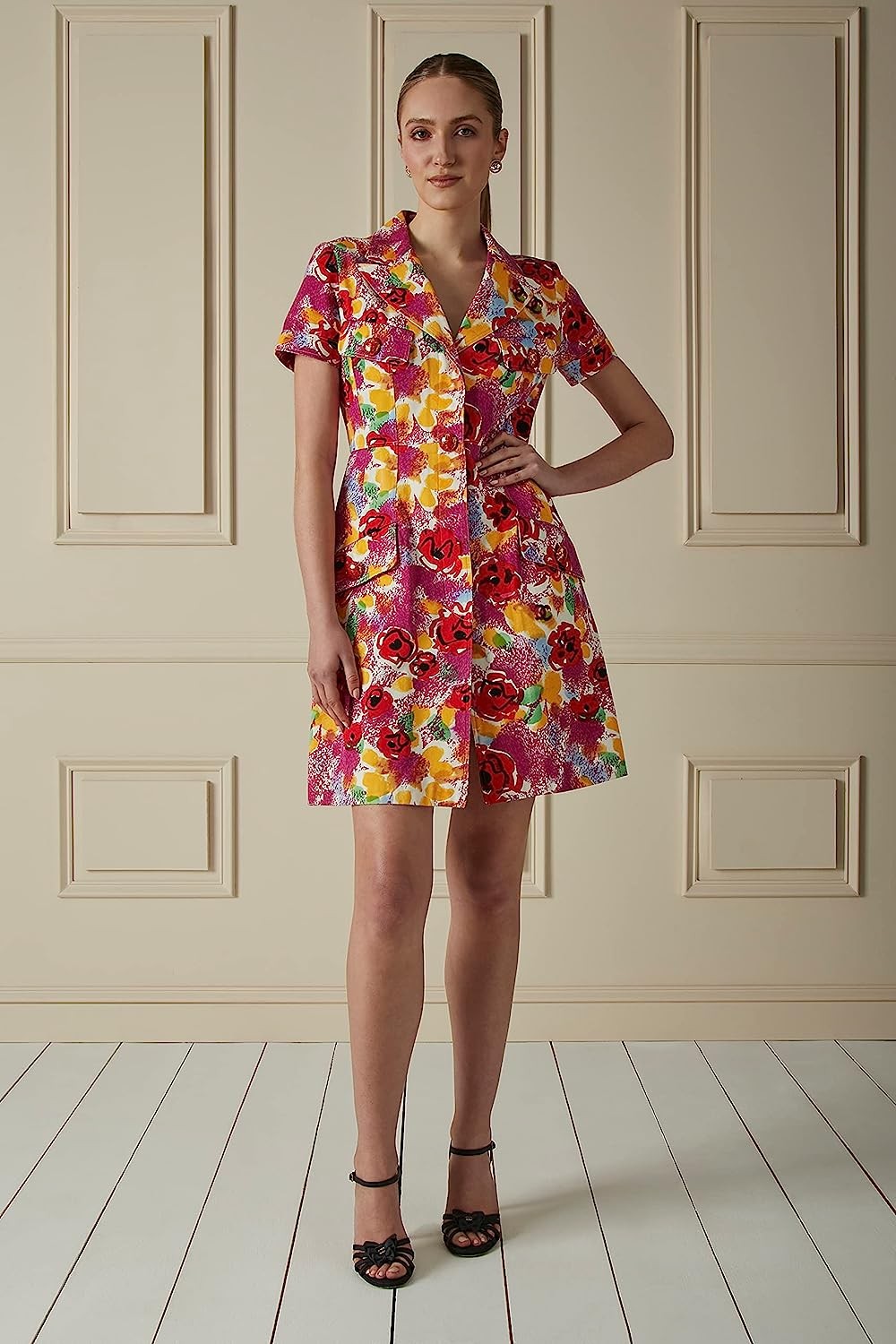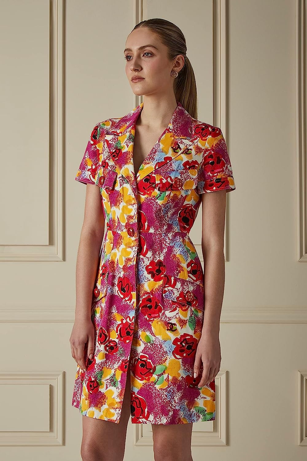 • A sartorial mood boost at its finest, this Spring 1997-era mini utility dress is crafted from denim that's splashed with color and graffitied with 'CC' and camellia flowers. It's cut with pointed lapels and is delightfully embellished with red buttons painted with palm trees. Slot yours into your spring-summer wardrobe with ease.