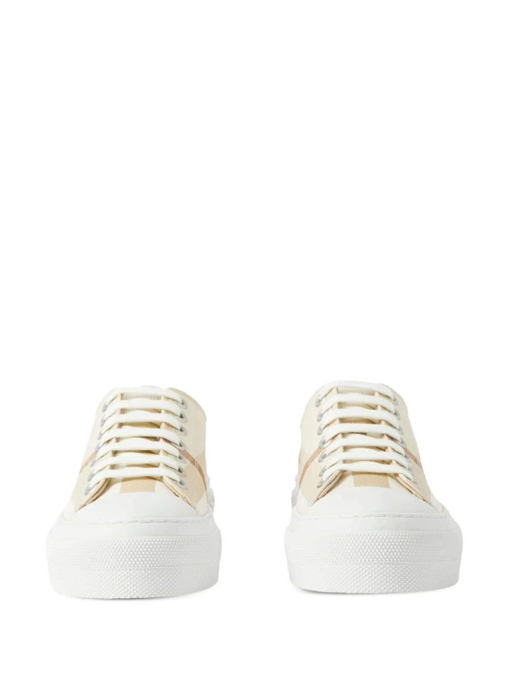 Featuring beige, sheepskin, cotton, check pattern, embossed logo to the rear, rubber toecap, round toe, front lace-up fastening and flat rubber sole.