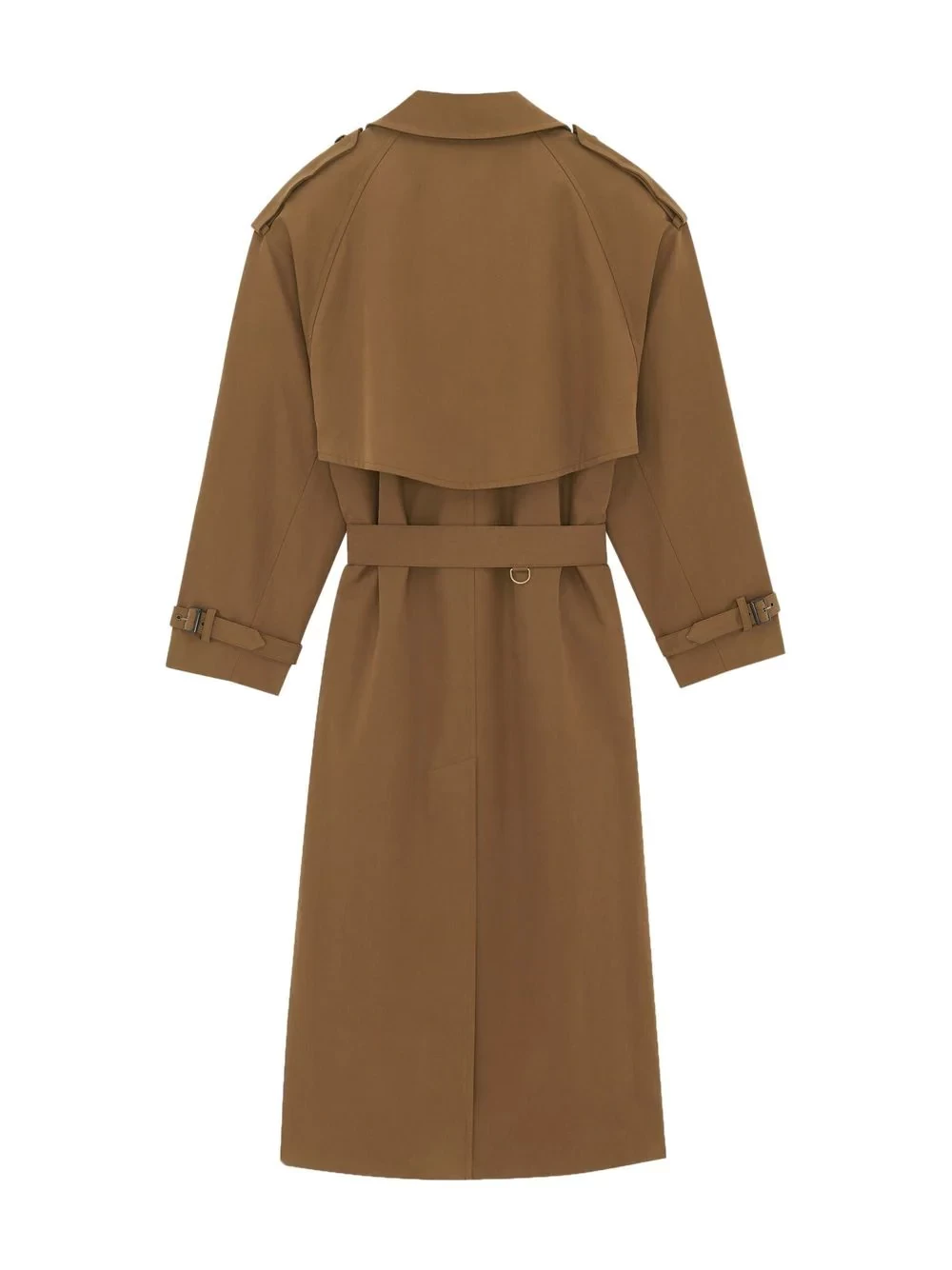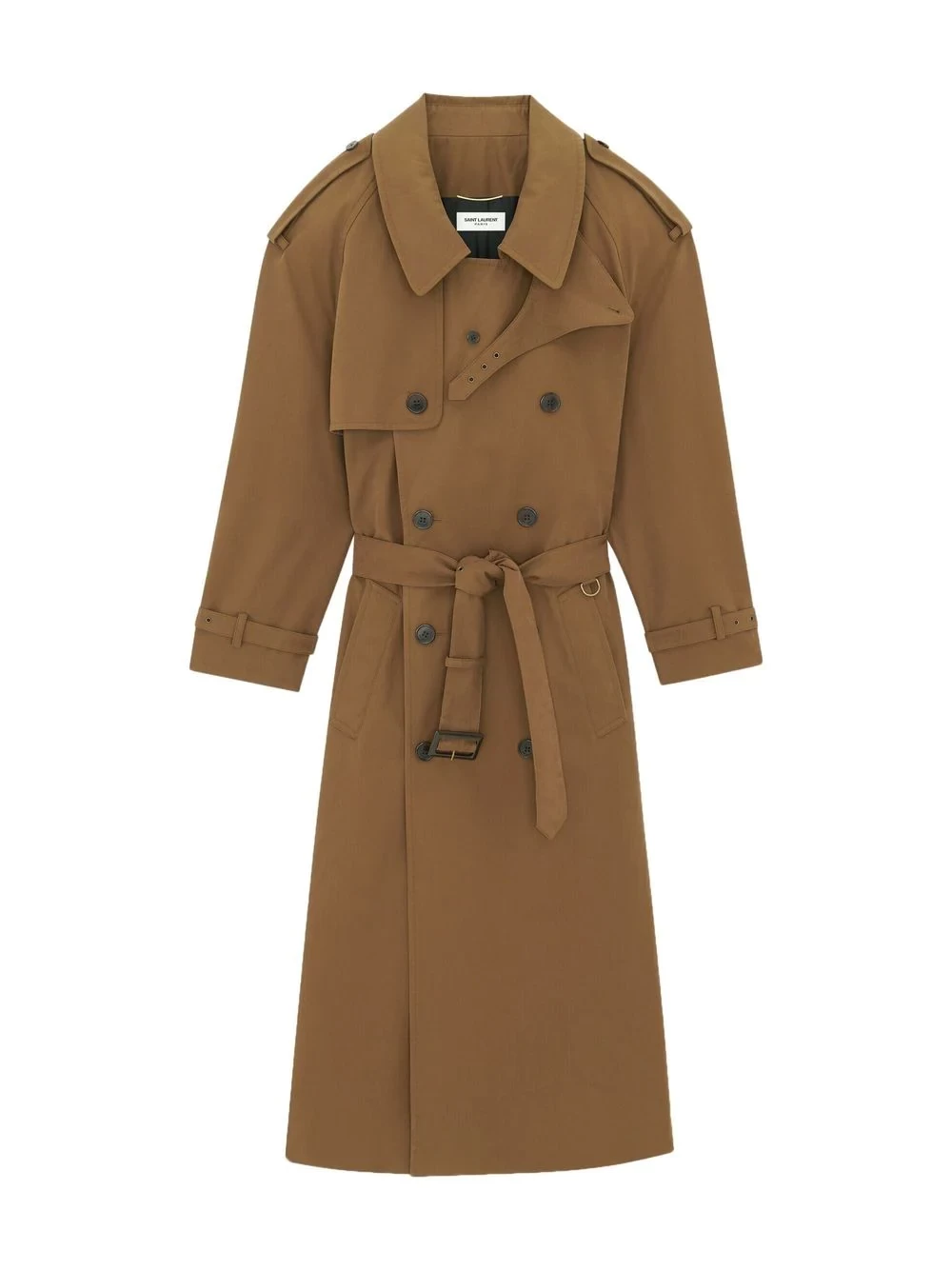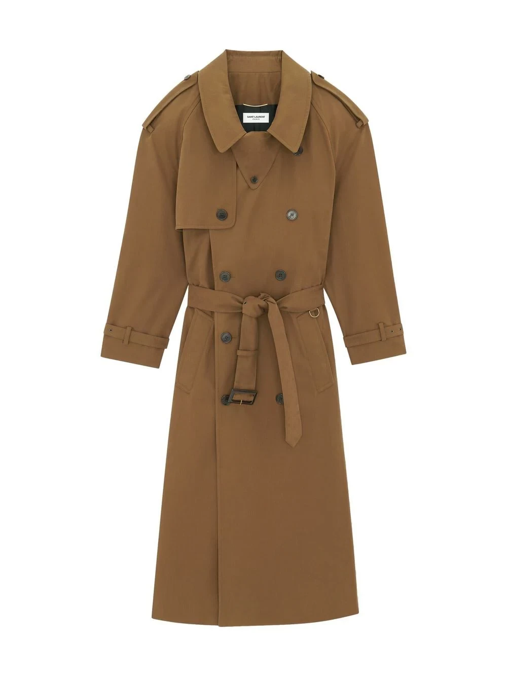 featuring brown, cotton, epaulettes, notched lapels, double-breasted button fastening, belted waist, long sleeves, slip pockets to the sides, central rear vent and straight hem.