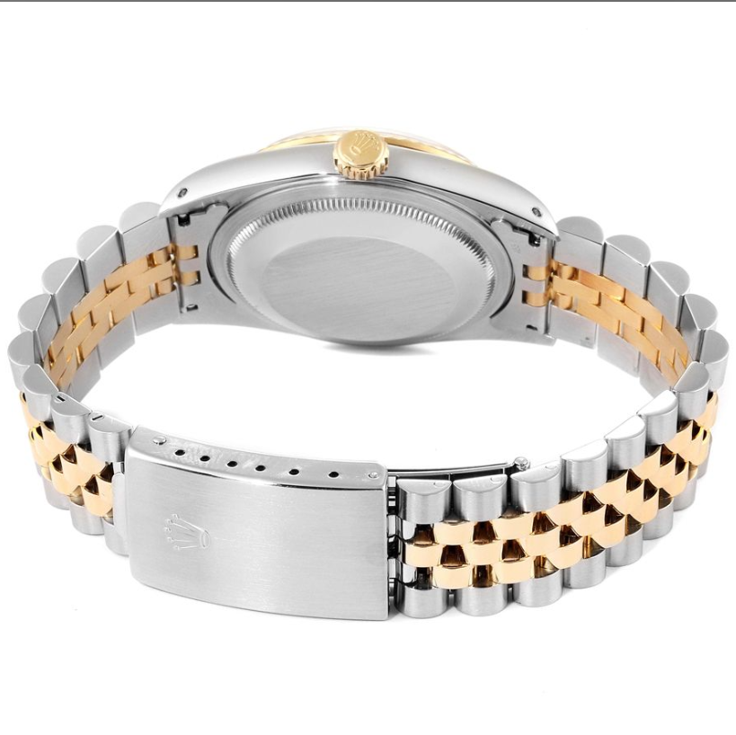 This 36mm midsize watch features a stainless steel case with an 18k yellow gold fluted bezel and a two tone Jubilee bracelet. The Champagne dial has index hour markers and a date window displayed under a cyclops lens at 3 o'clock. It is powered by the Rolex Caliber 3135 self-winding automatic COSC Superlative Chronometer certified movement with a 48 hour power