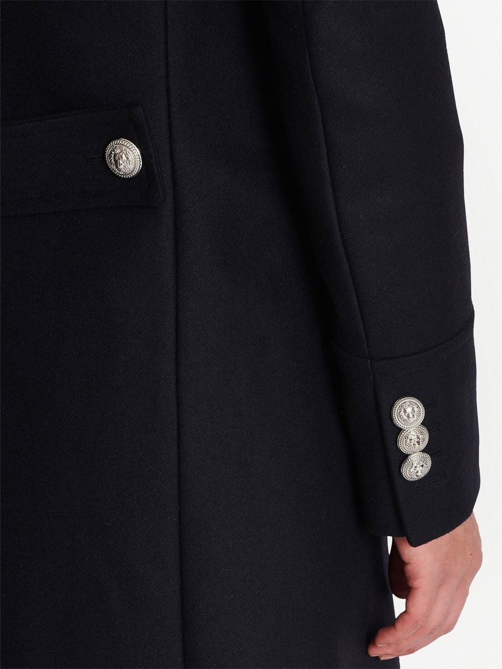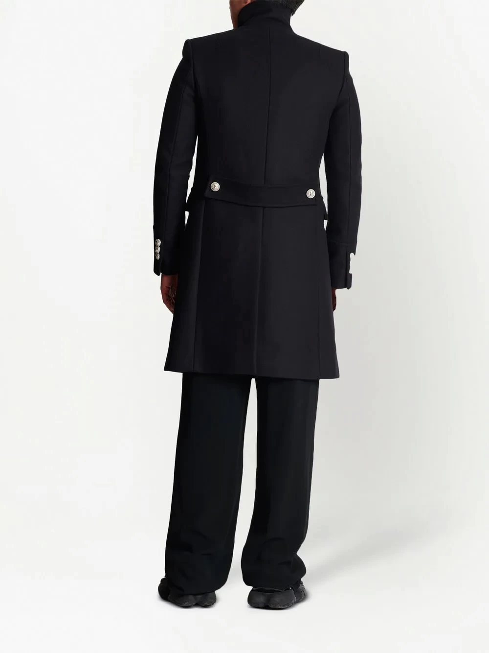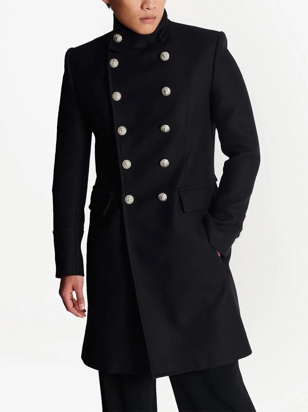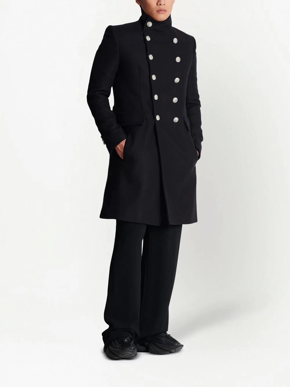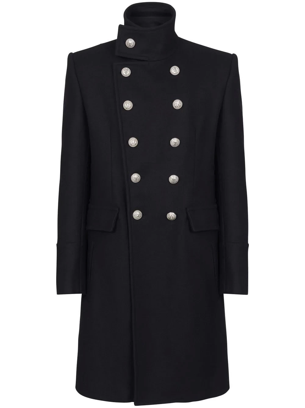 Inspired by military silhouettes, Balmain introduces this double-breasted coat. This 100% wool piece is detailed with branded silver-tone buttons and a high neck as a reference to army pieces.