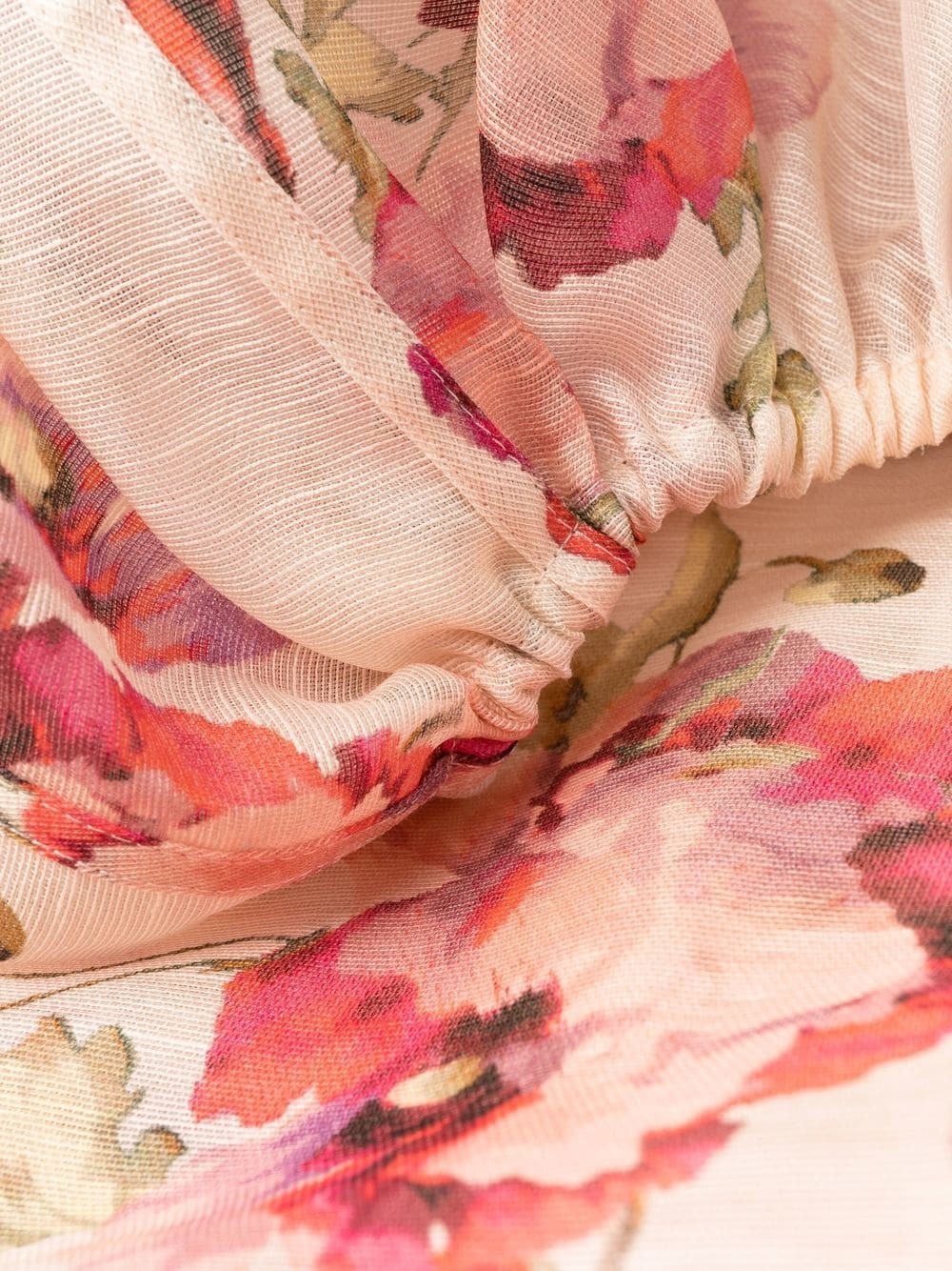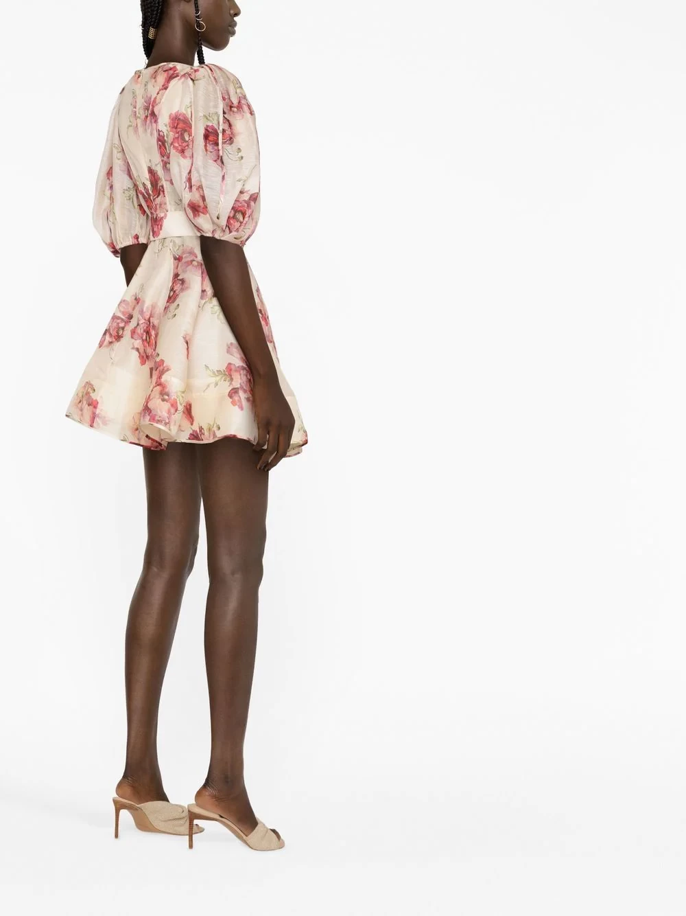 collection is threaded with romantic inspirations. Part of the offering, this minidress is scattered with intricate floral blooms and has a set of voluminous puff sleeves.