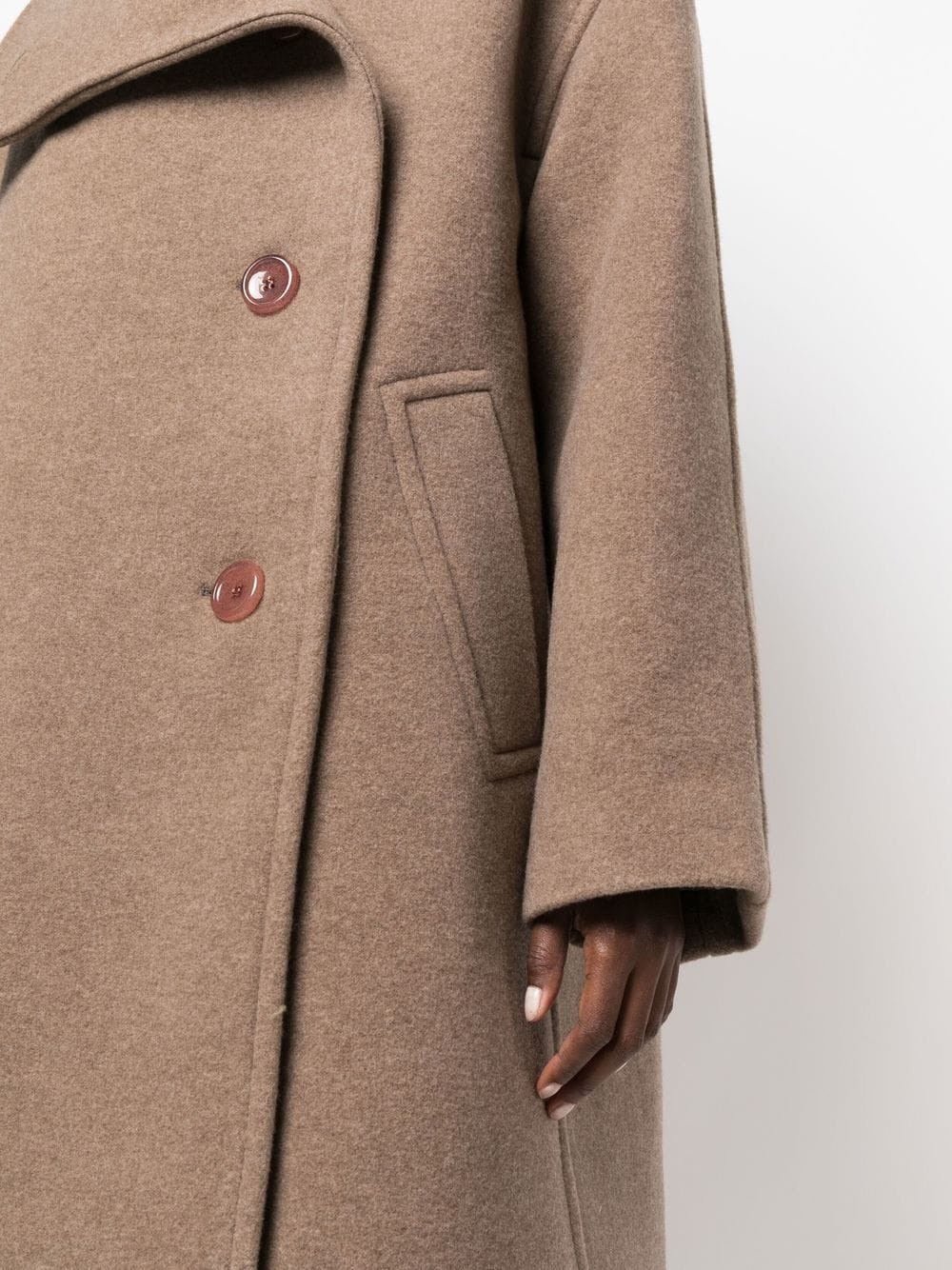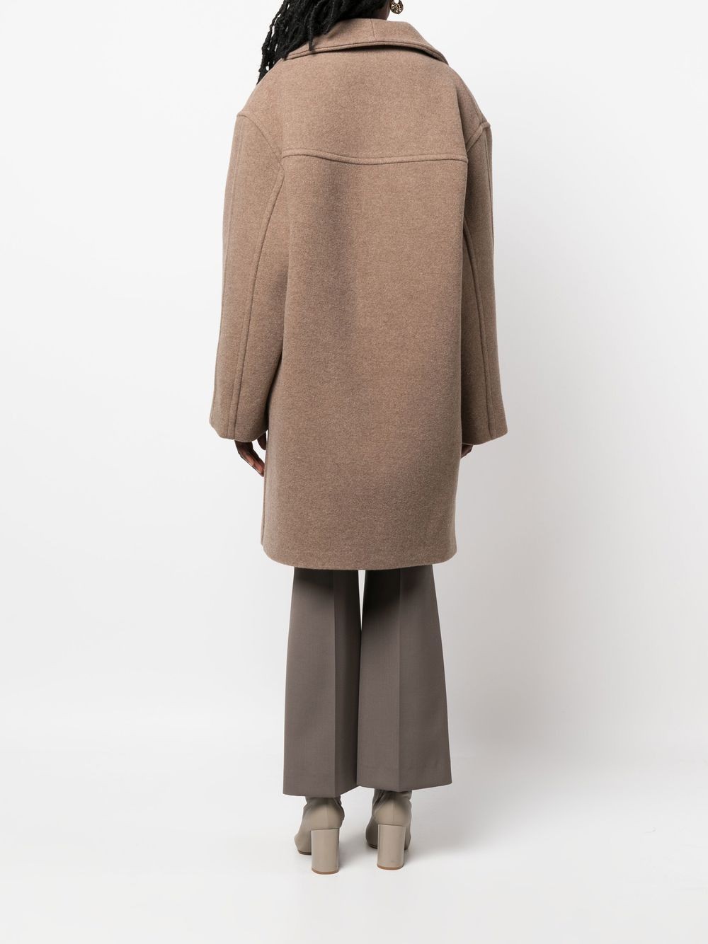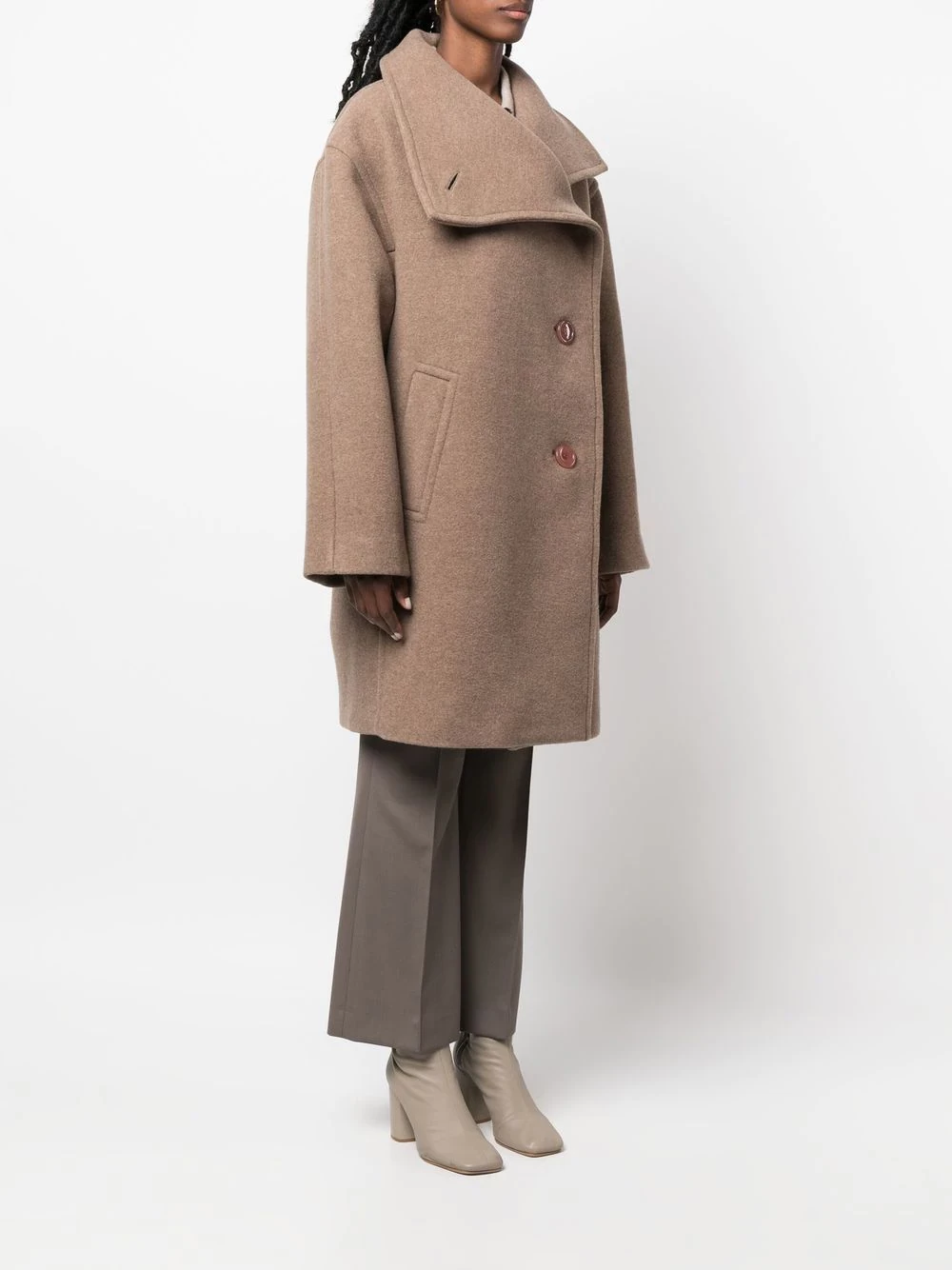 featuring taupe brown, wool blend, funnel neck, front button fastening, drop shoulder, two diagonal pockets to the sides and mid-length.