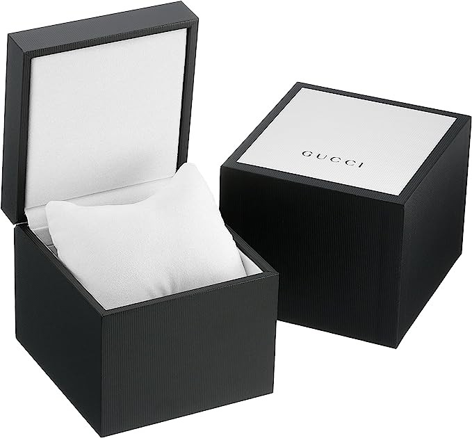 •  Rose gold-tone watch featuring G-shape case and black sunray dial with logo at 12 o'clock