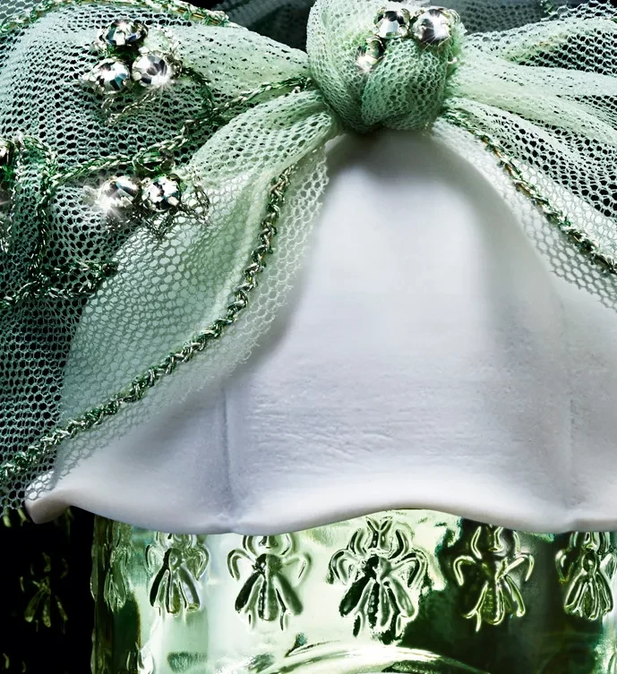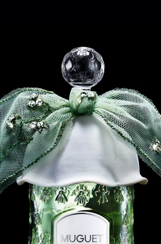 To reflect the soft texture of lily-of-the-valley leaves, Guerlain invited the atelier les Ateliers Vermont, which has embroidered for many haute couture houses since 1956, to make a green tulle bow. The edge of the bow is embroidered with green thread. After hours of meticulous work by the embroiderer, delicate lily-of-the-valley branches stand out from the "leaves", shining like dewdrops.