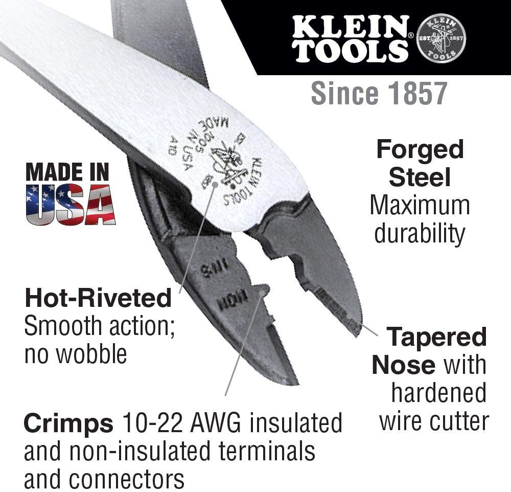 STRIPPING AND CUTTING TOOLS: High-Leverage Cable Cutter, Crimping/Cutting Tool – 10-22 AWG Non-Insulated and Insulated Connectors, Klein-Kurve Wire Stripper/Cutter – 10-18 AWG Solid & 12-20 AWG Stranded and Klein-Kurve Dual NM Cable Stripper/Cutter