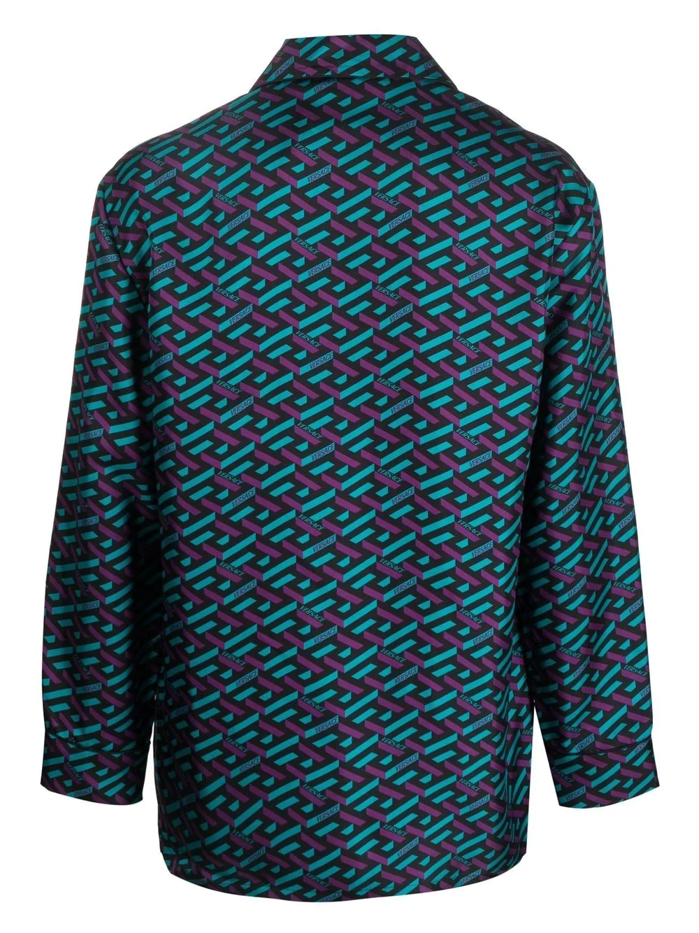 La Greca silk pyjama top from Versace featuring teal green, silk, signature La Greca print, all-over logo print, front button placket and long sleeves.