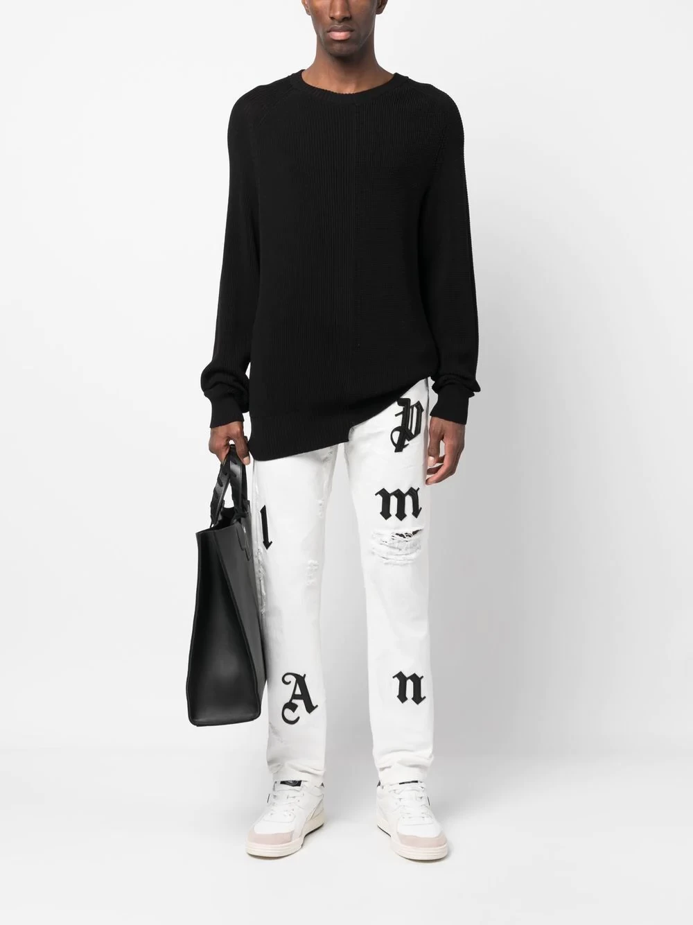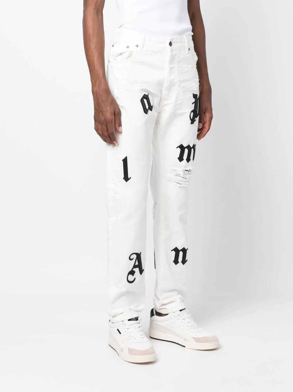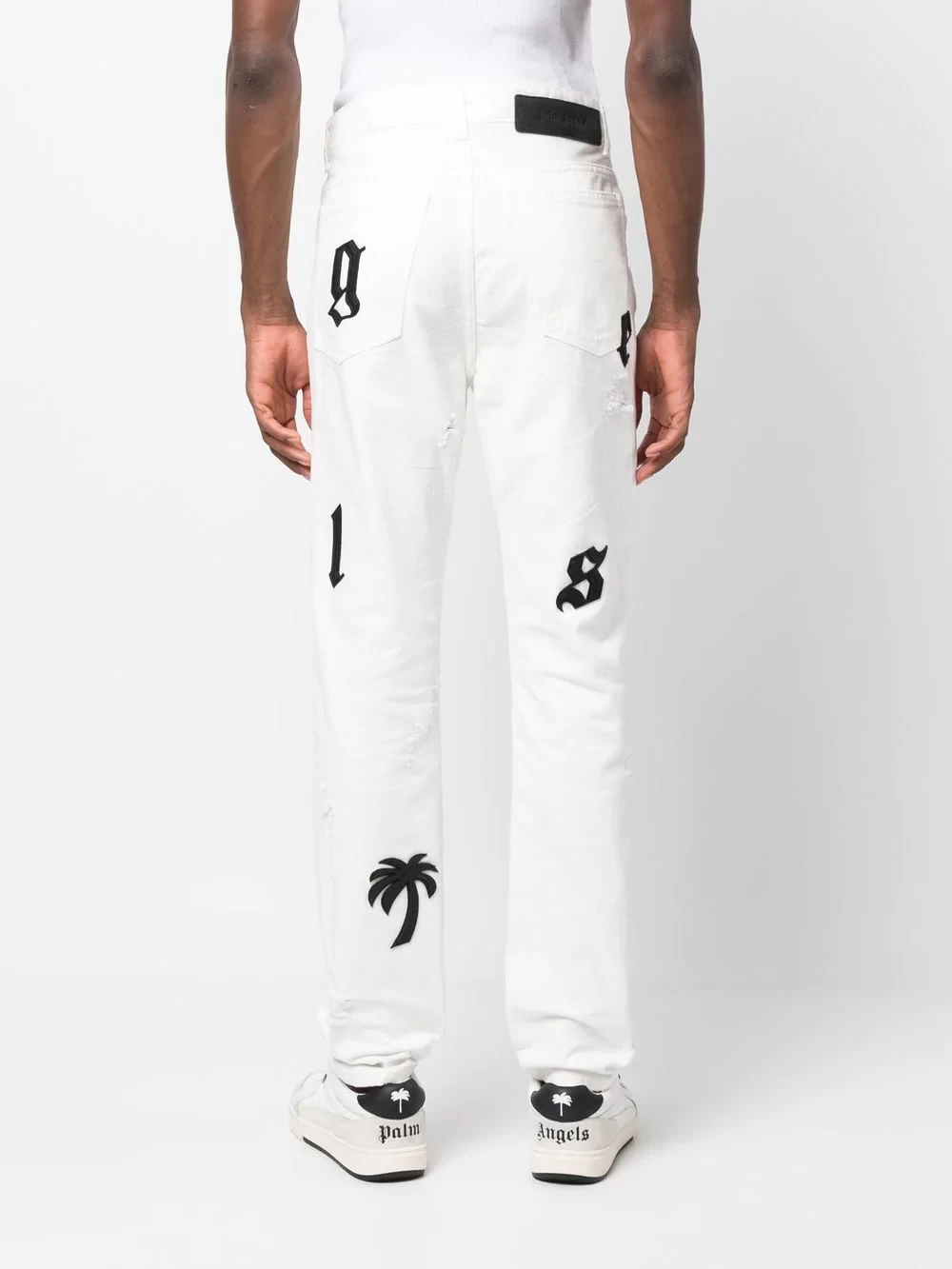 Inspired by Californian streetwear style, the use of branding is a key feature of Palm Angels designs, as seen with these slim-cut jeans. The white-hued pair is adorned with logo patches all-over and a casual distressed finish.