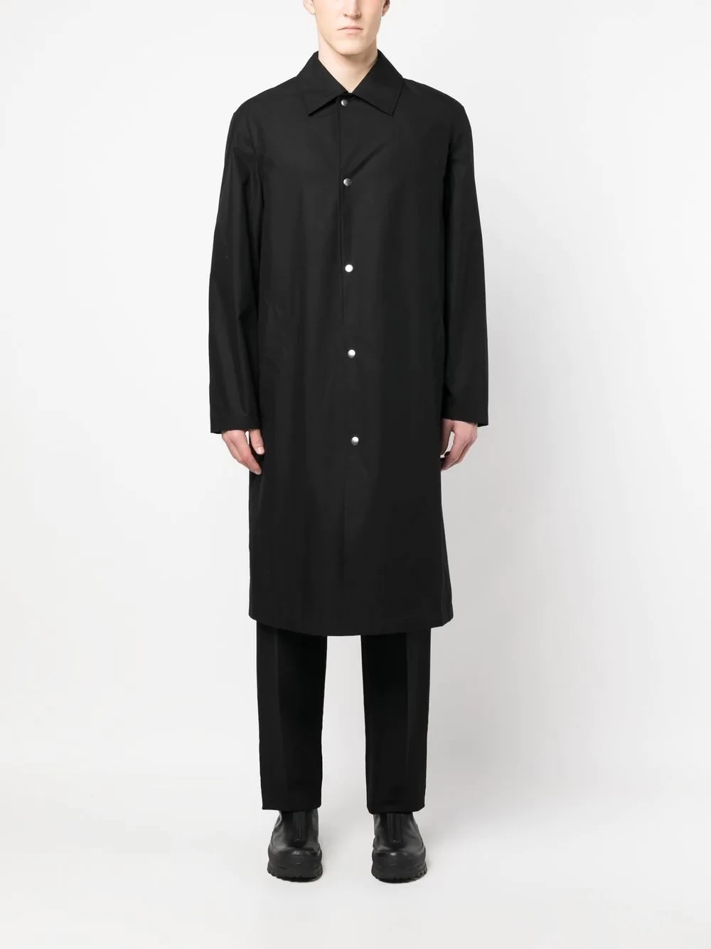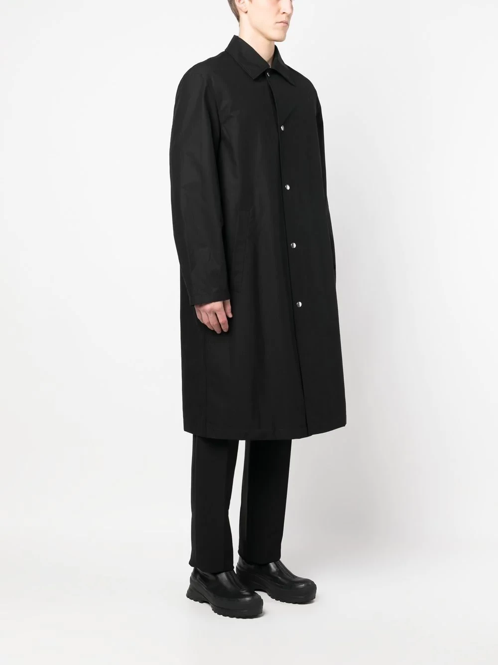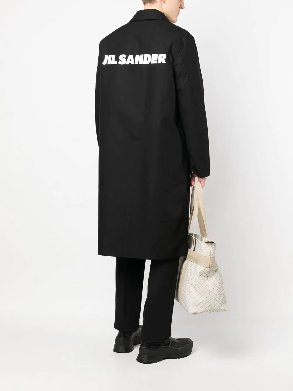 Renowned for its minimalist design ethos, Jil Sander has continued to flourish with sibling designers Lucie and Luke Meier at the helm. Staying true to the brand’s reputation, this coat is presented in an understated black colourway that boasts a contrasting logo print to the rear.