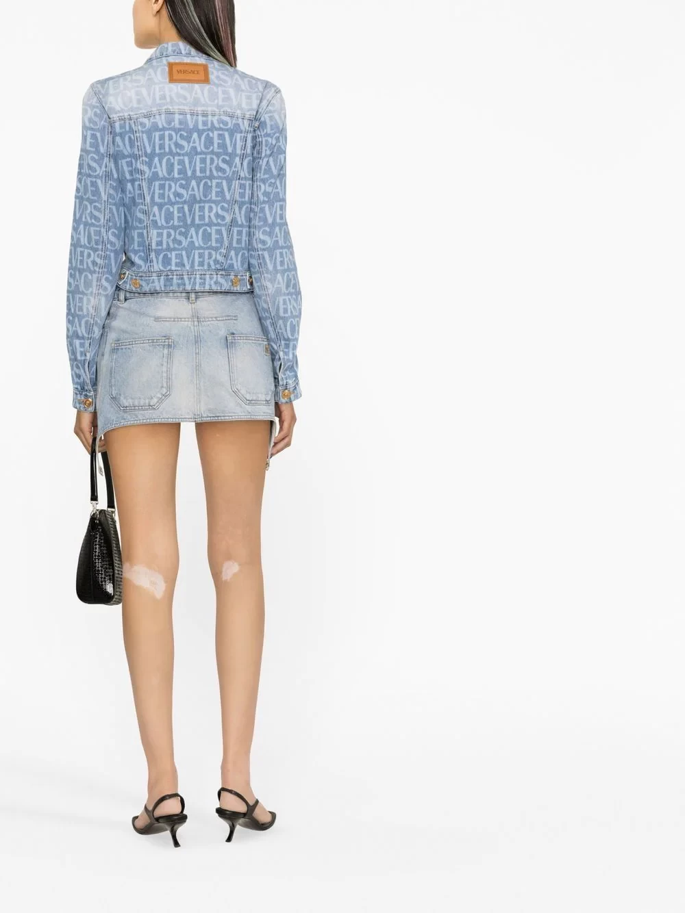 Proving Versace's penchant for logomania, this classic denim jacket appears reinvented with an all-over logo print that blends in with the light-washed construction.