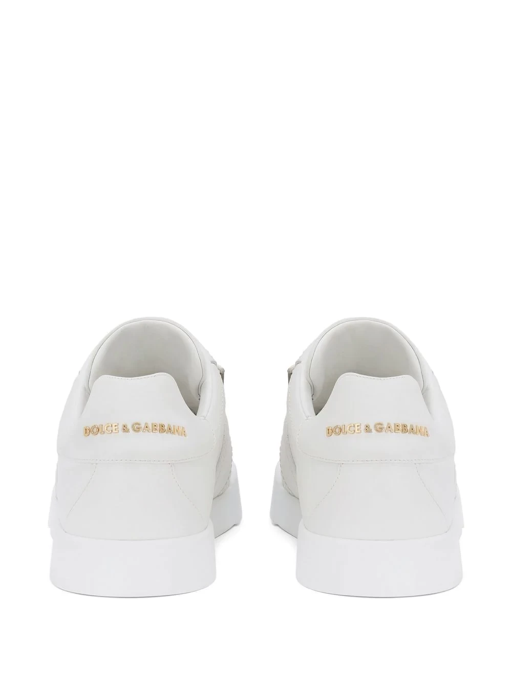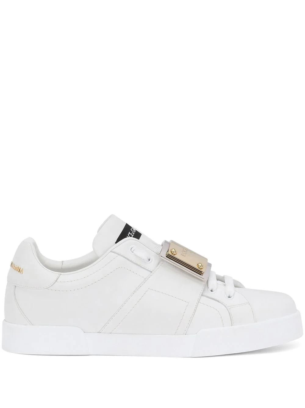 Portofino low-top sneakers from DOLCE & GABBANA featuring white, calf leather, gold-tone logo plaque, logo lettering, round toe, front lace-up fastening, logo patch at the tongue, branded insole and flat rubber sole.