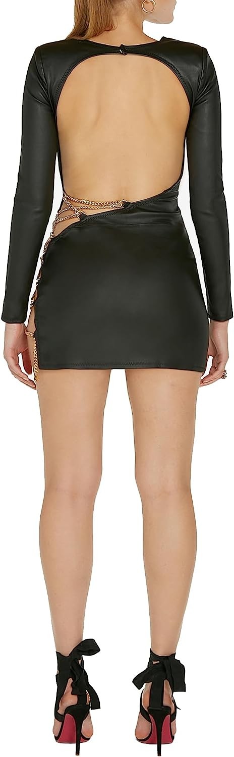 •  Spend a transcendental moment to embrace your inner goddess, the Nirvana mini dress in stretch leather is the ultimate power statement. The hip high side split is laced with chain, adding a tough structural element to the sensual embrace of the nappa leather and intimate tailored fit. Long sleeves and a round neck balance the open back, creating an elemental, dynamic look.