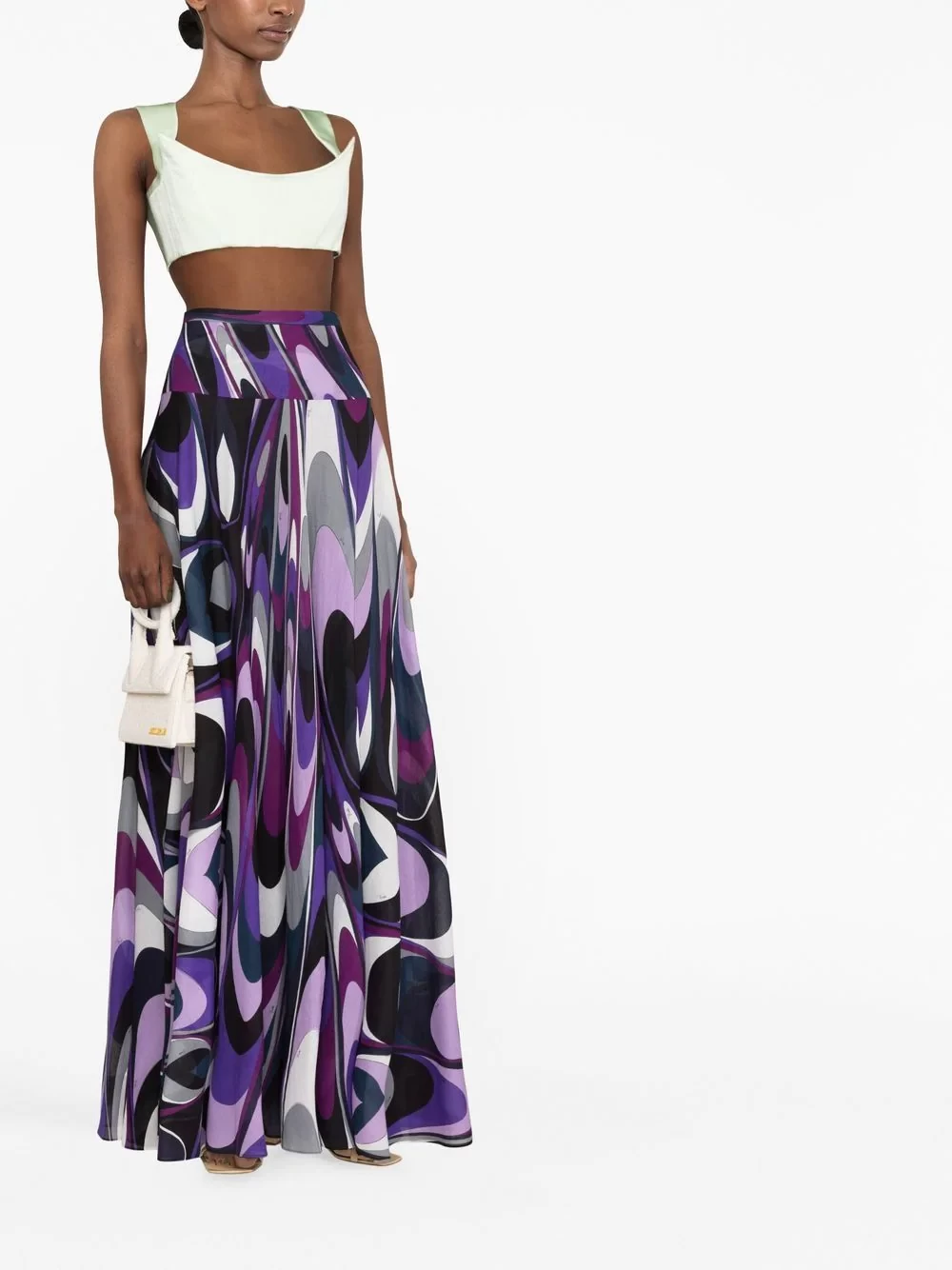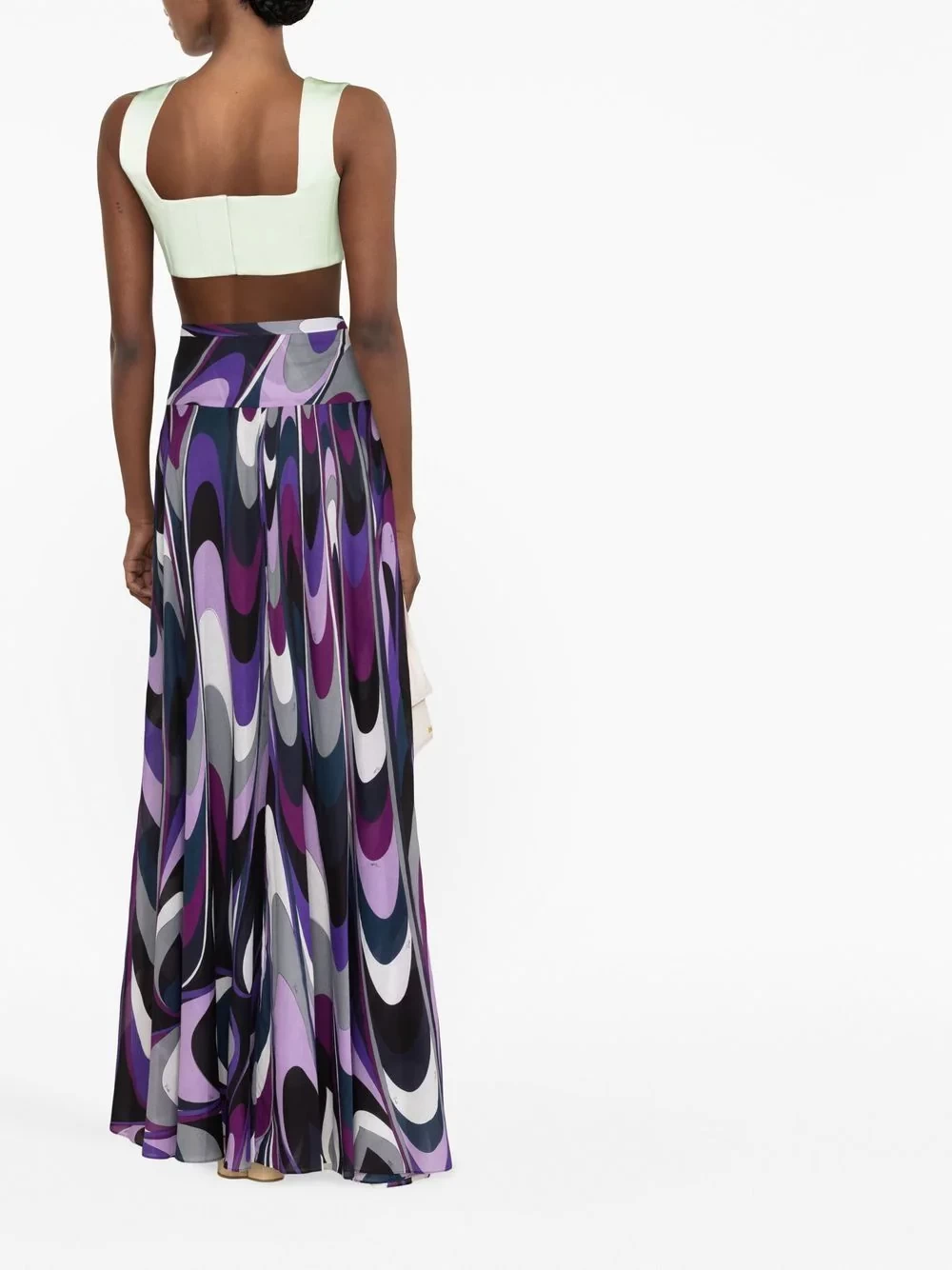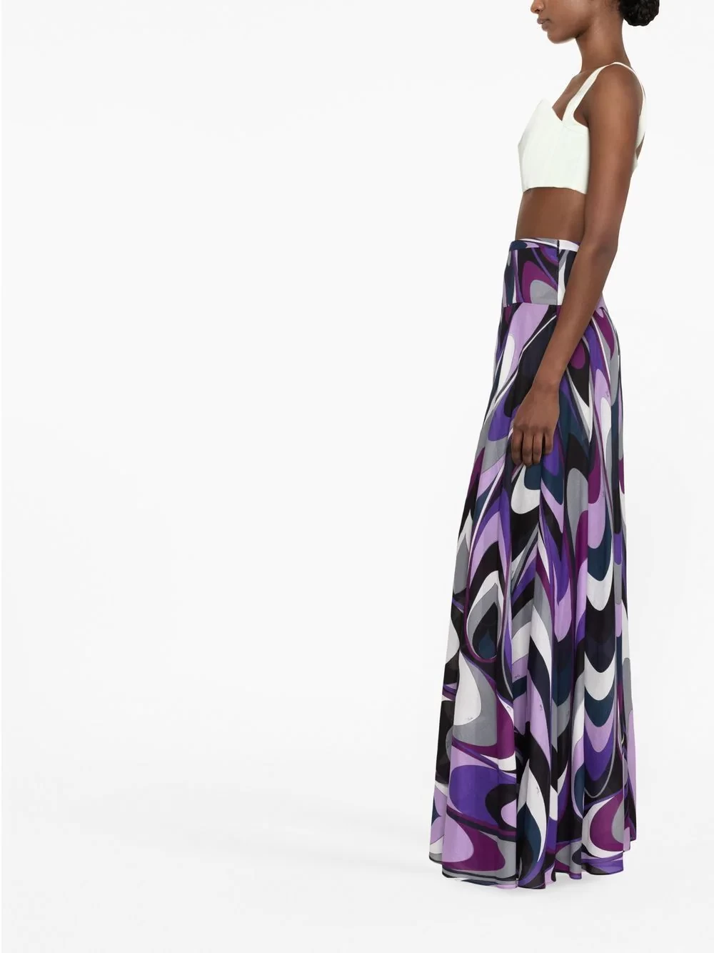 this maxi skirt's flowing silhouette adds movement to the pattern's purple and grey swirls.