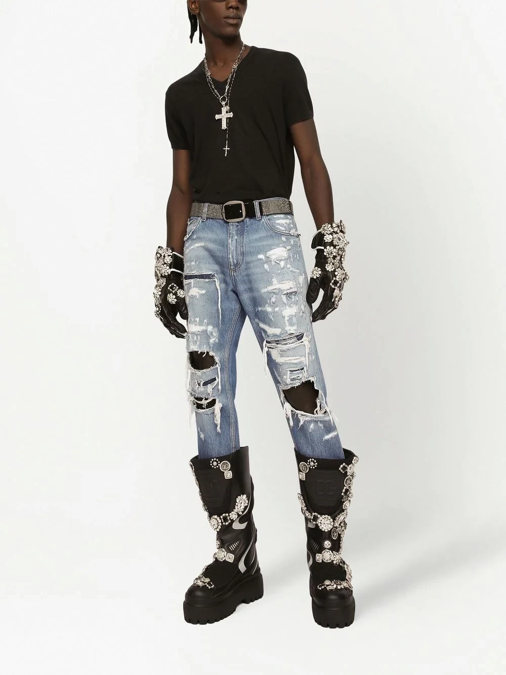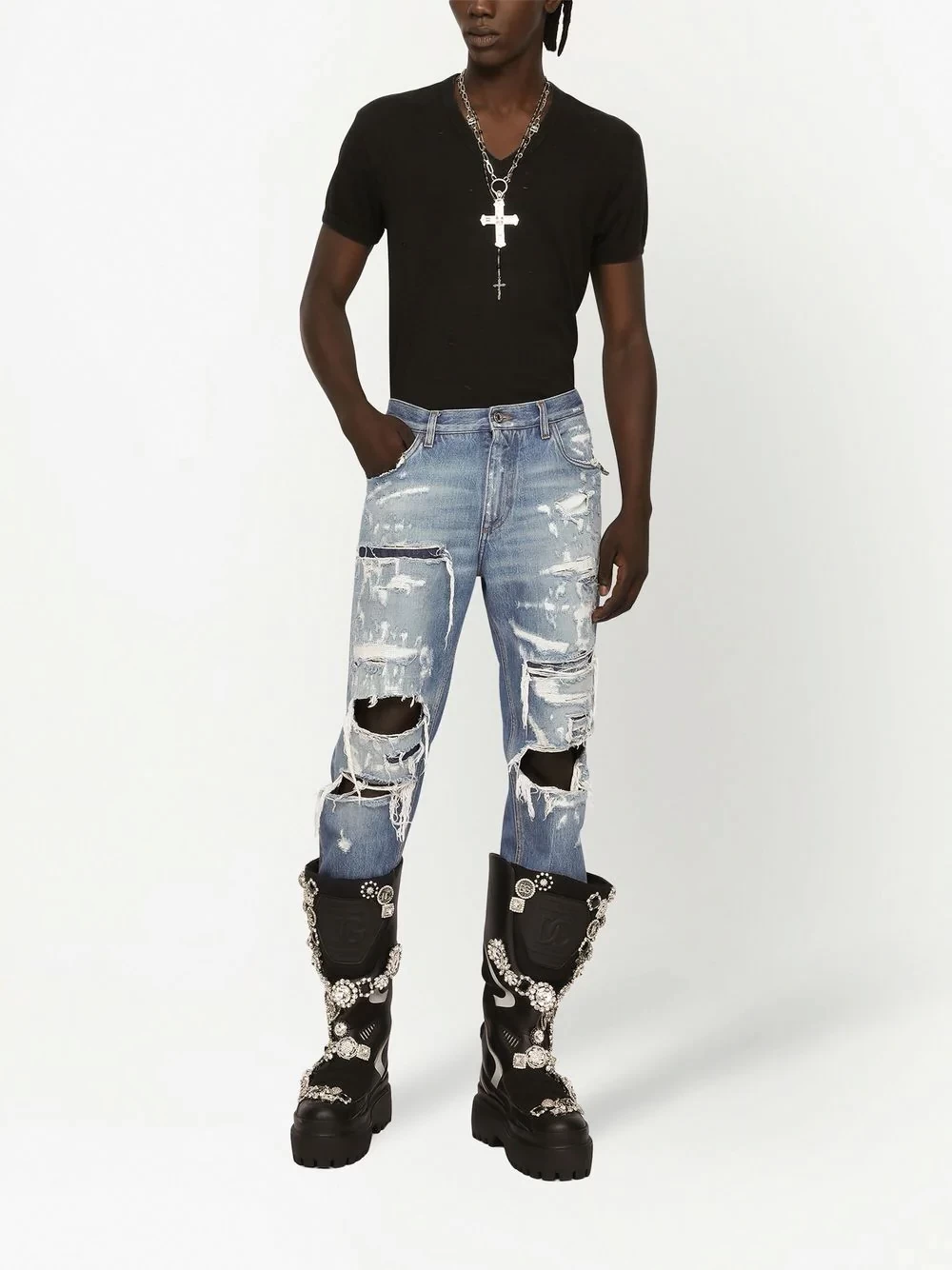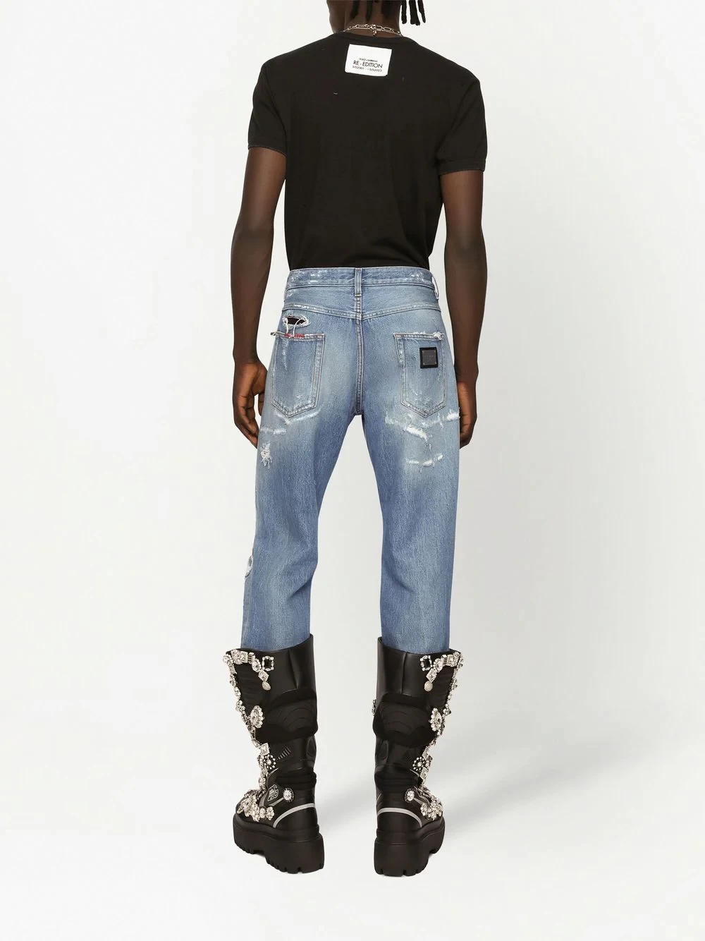 ripped-detail straight-leg jeans from DOLCE & GABBANA featuring light blue, cotton, denim, ripped detailing, concealed front fastening, belt loops, classic five pockets, logo plaque and straight leg.