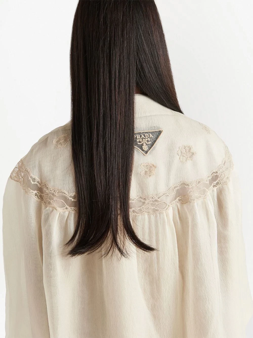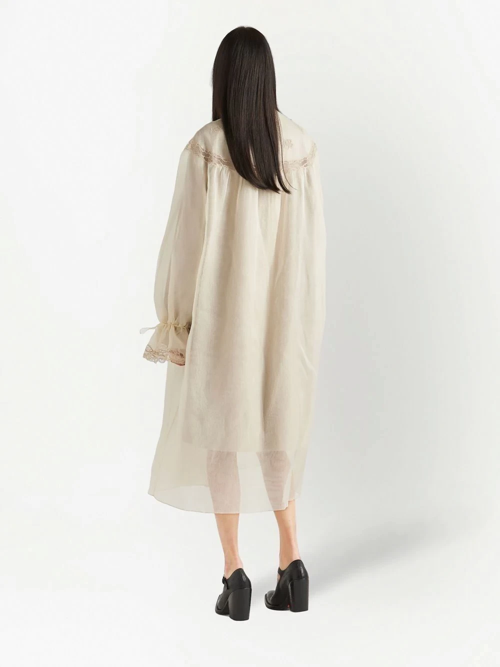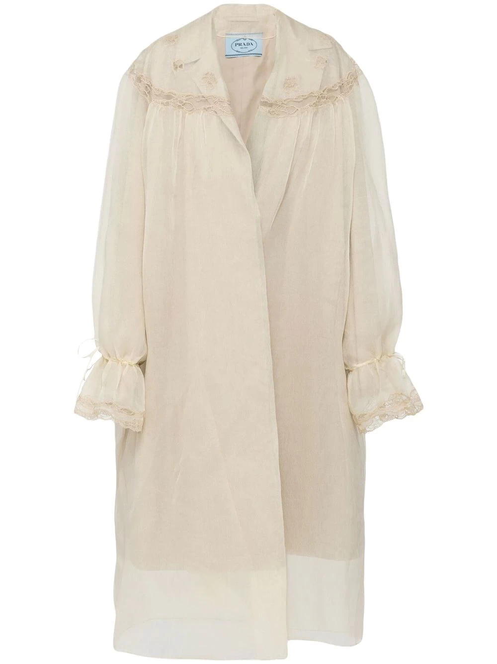 Combining a Panama cotton coat with a menswear design and an overlay adorned with delicate lace trims, this single-breasted coat from Prada's SS23 collection is rendered in a cream colourway for a timeless finish.