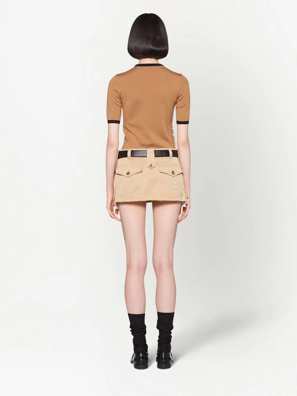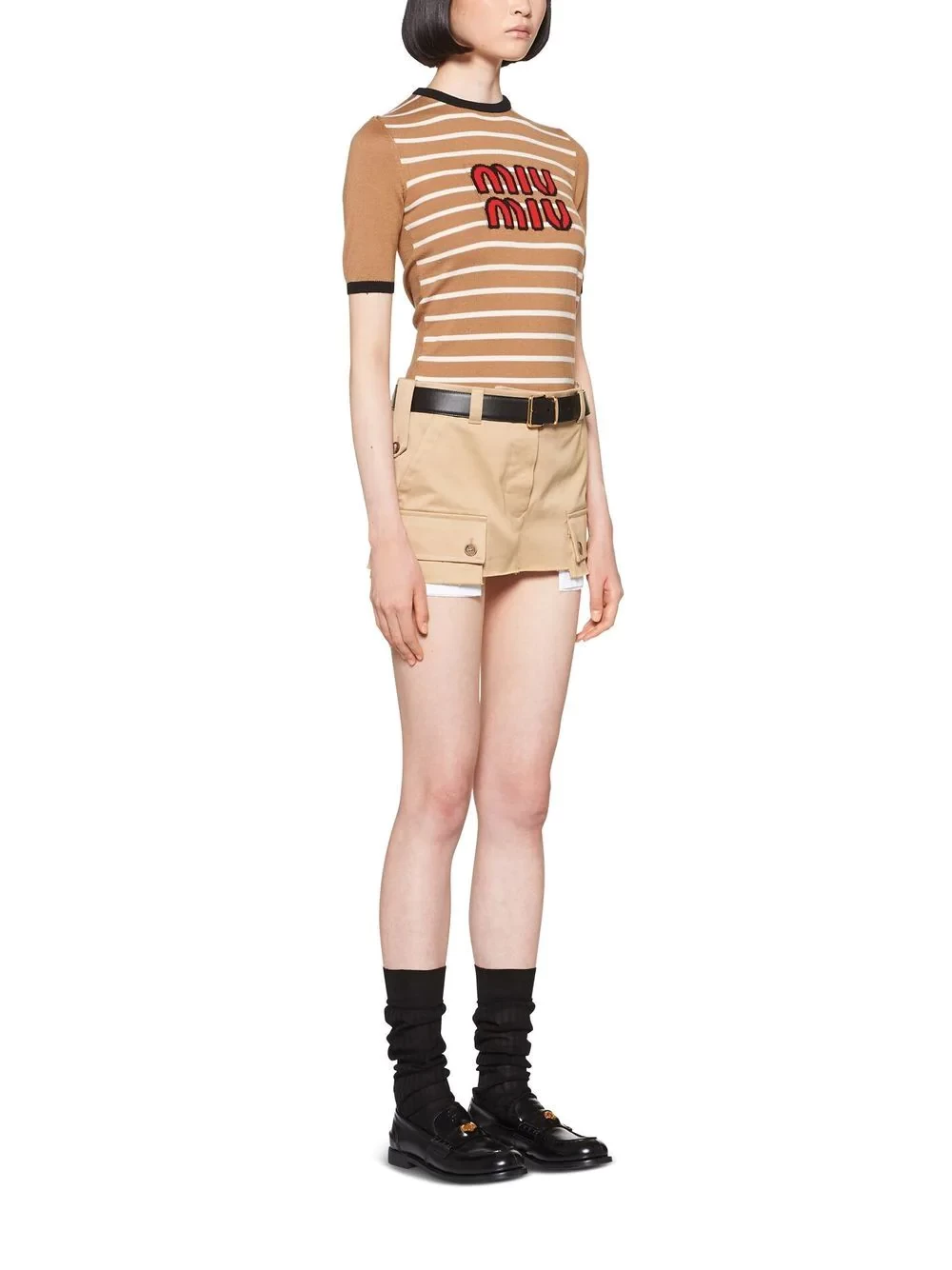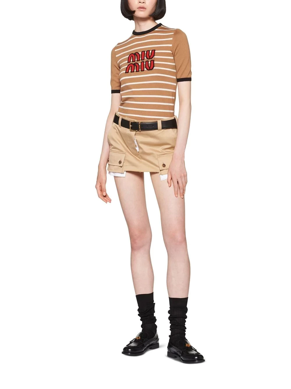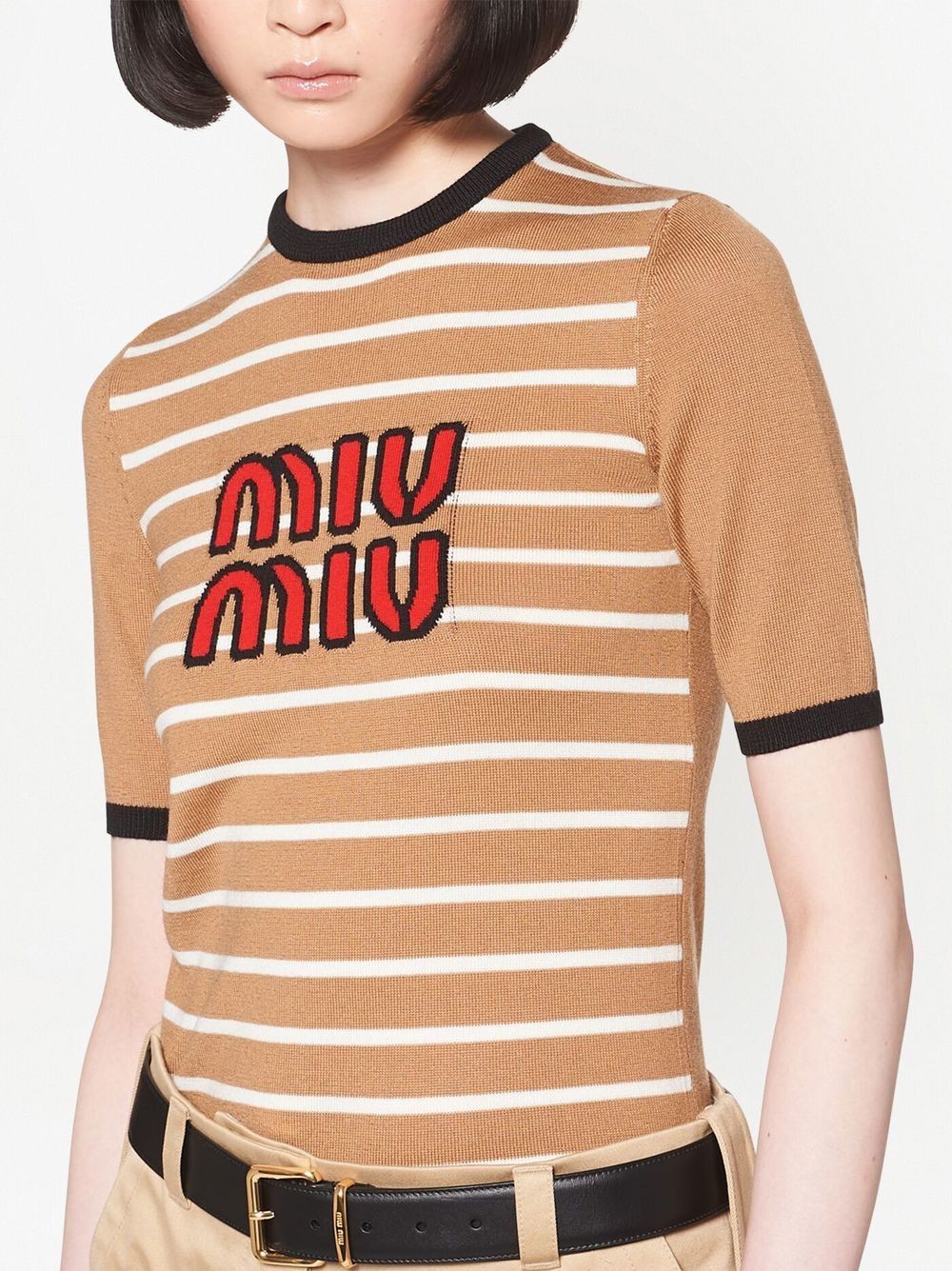 striped knitted top from MIU MIU featuring camel brown, multicolour, virgin wool, fine knit, horizontal stripe pattern, intarsia-knit logo, round neck, short sleeves and straight hem.