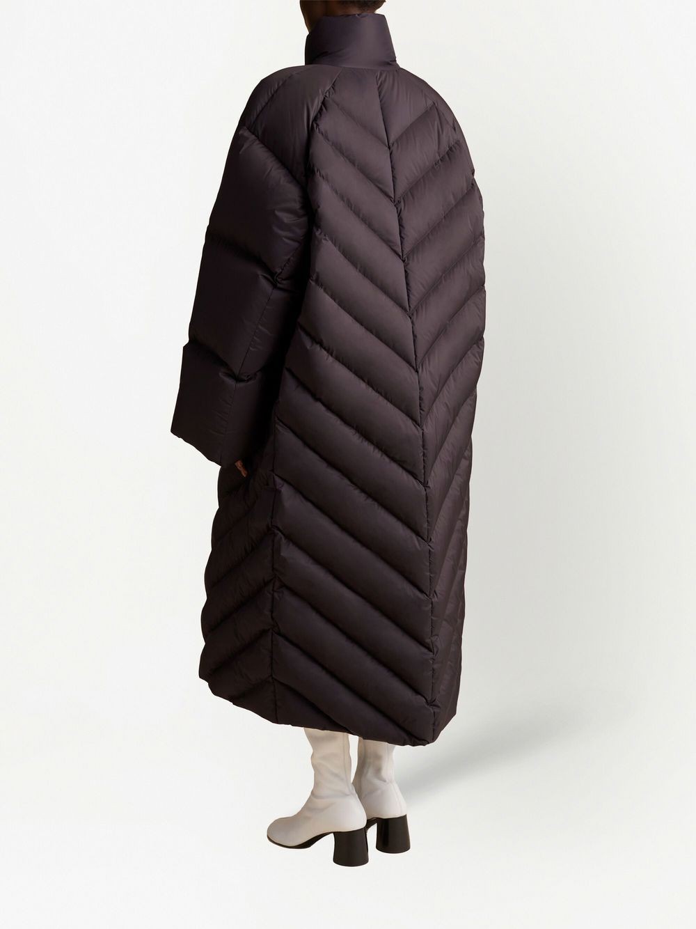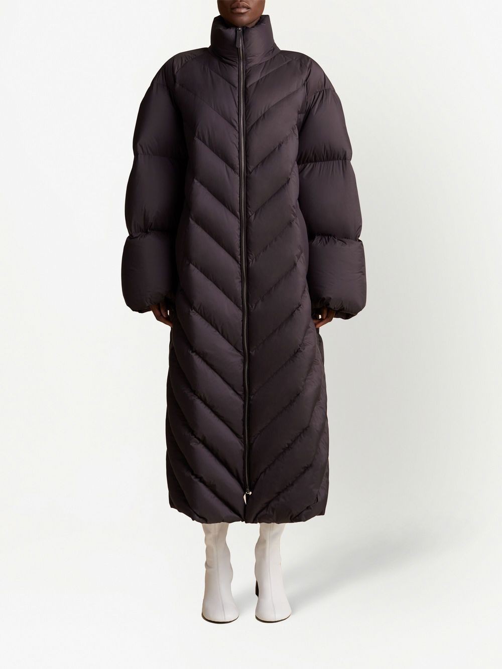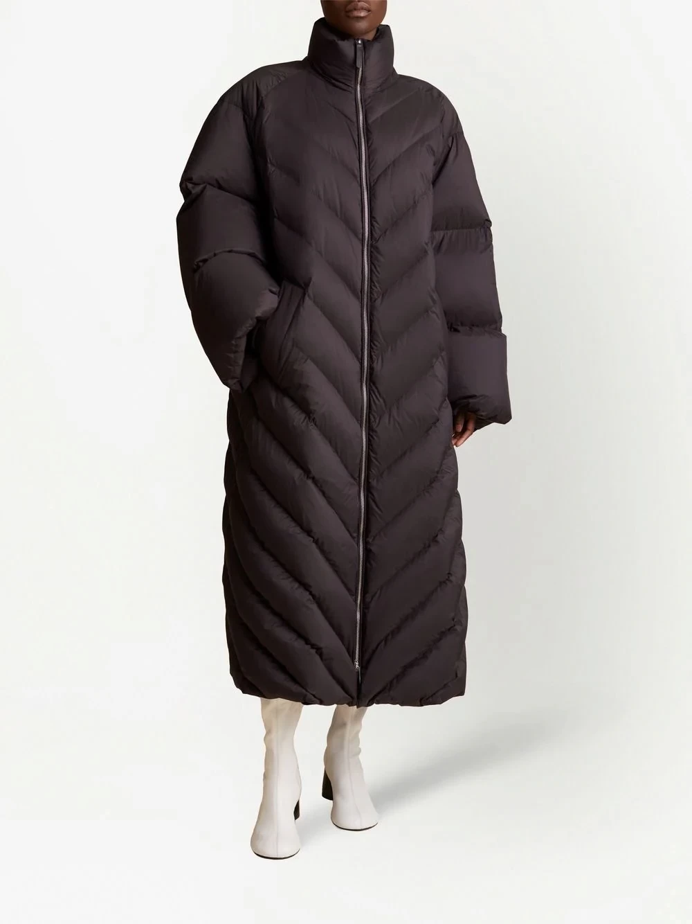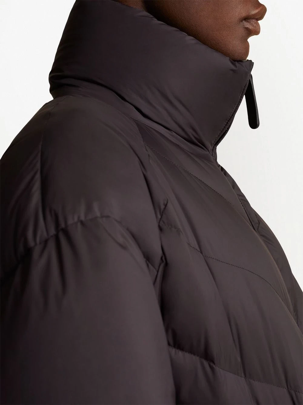 featuring coffee brown, padded design, high neck, front zip fastening, long sleeves and mid-length.