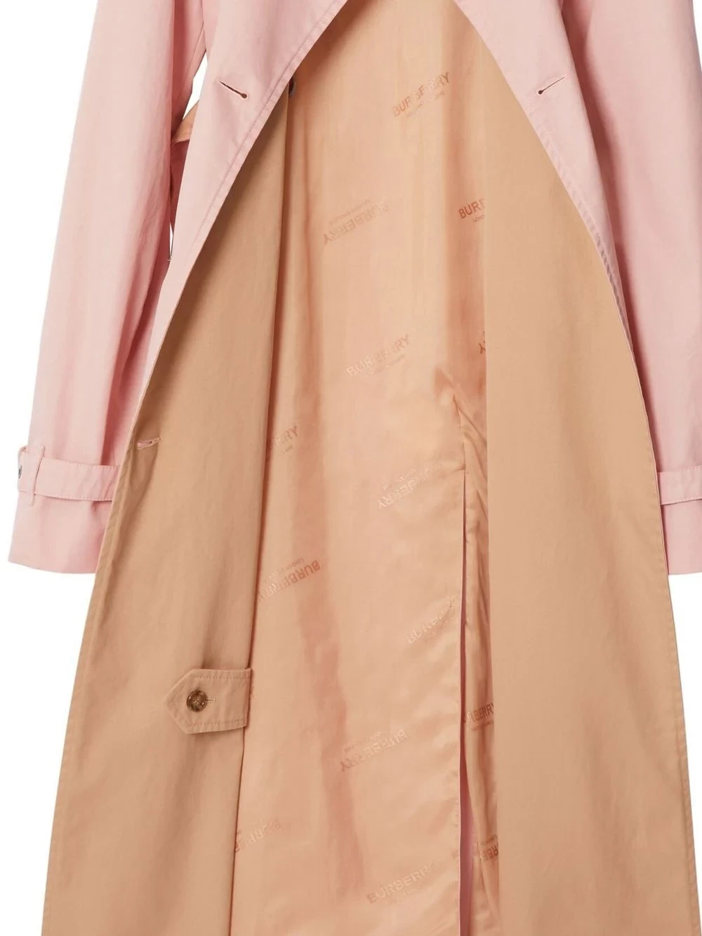 Featuring light pink, cotton, notched lapels, double-breasted button fastening, belted waist, long sleeves and mid-length.