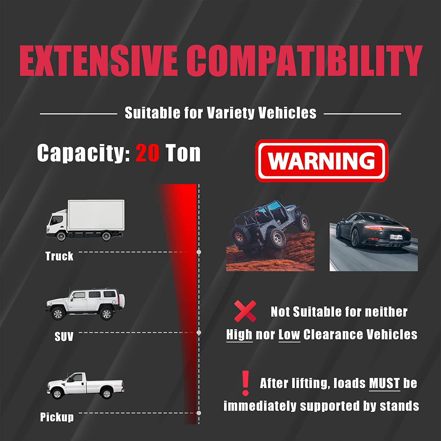 • Product 2: Features a lifting range between 10-7/16" to 20-1/16" with a 20 ton (40,000 lb) load capacity; Designed for operating either manually or pneumatically